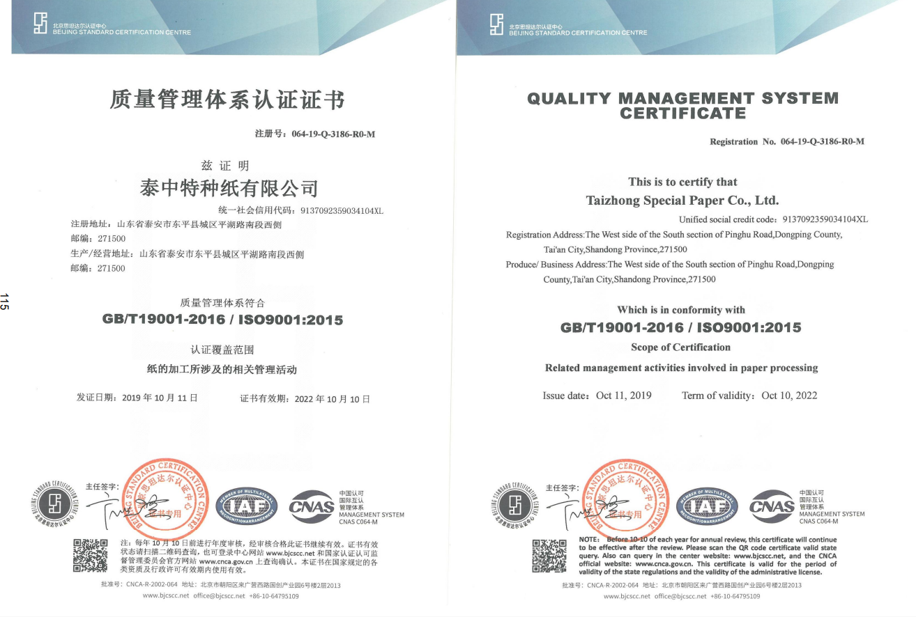 质量证书成果